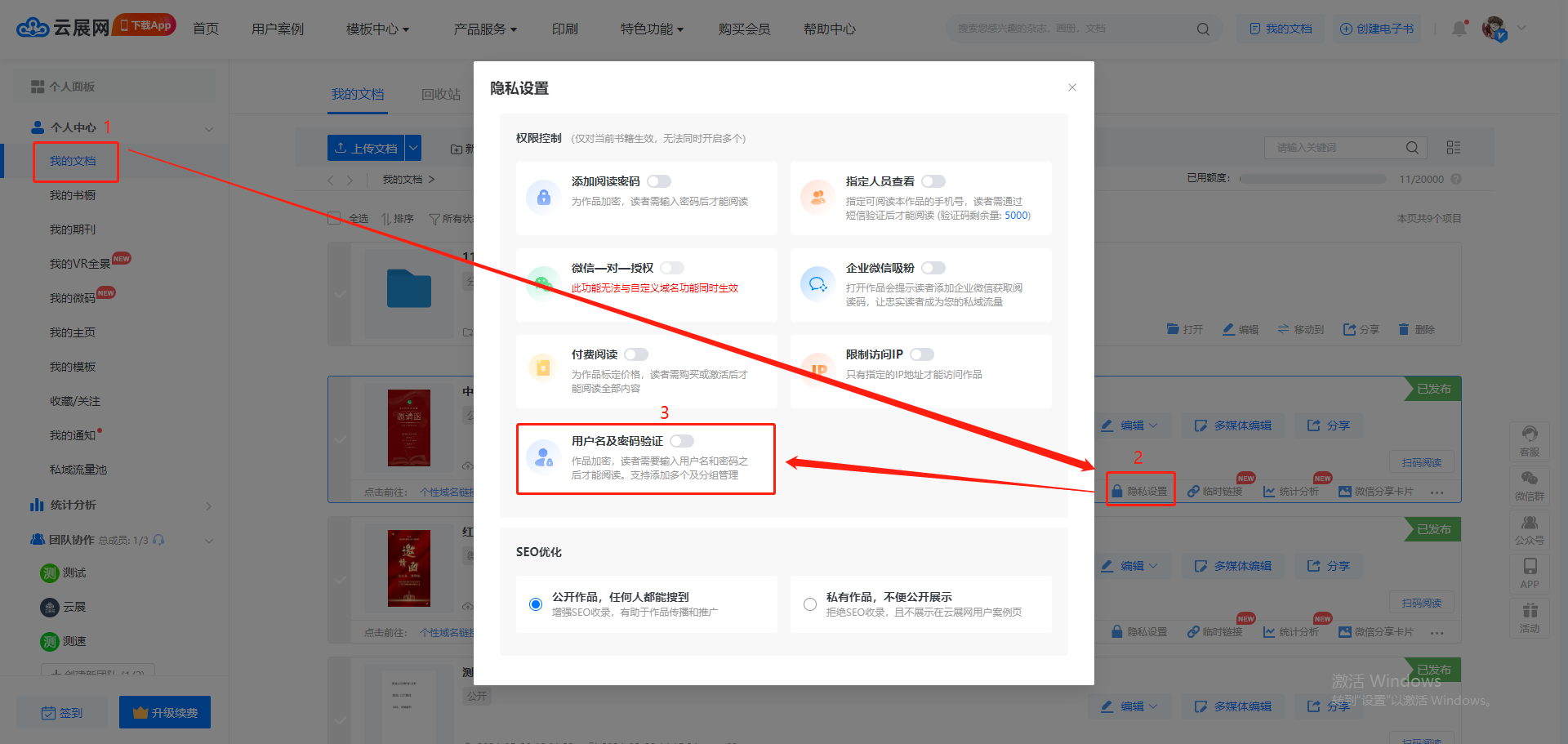 點(diǎn)擊【我的文檔】,選擇要設(shè)置的書本,點(diǎn)擊【隱私設(shè)置】,打開【用戶名及密碼驗(yàn)證】。