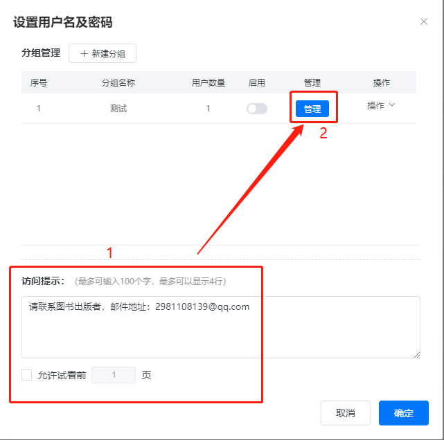 先在下方設(shè)置【訪問提示】以及允許查看前幾頁,然后點(diǎn)擊【管理】。
