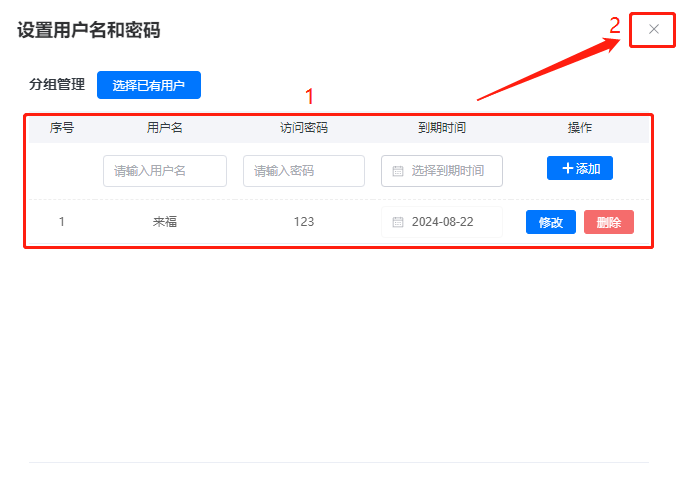 輸入【用戶名】、【密碼】,設(shè)置到期時間,點(diǎn)擊【添加】后,可以在下方看到創(chuàng)建好的用戶名和密碼,然后點(diǎn)擊右上角的【x】關(guān)閉界面。