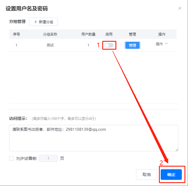 此項(xiàng)功能可以給書本為每位讀者創(chuàng)建單獨(dú)的用戶名和密碼,讀者只有輸入正確的用戶名和密碼才能觀看書本。