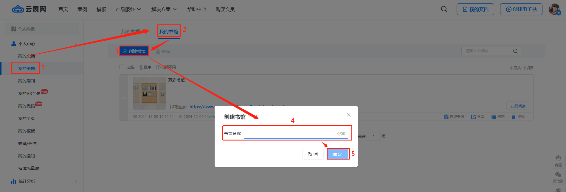 點擊【我的書櫥】,然后點擊【我的書館】,再點擊【創建書館】,輸入書館名稱,點擊確定。