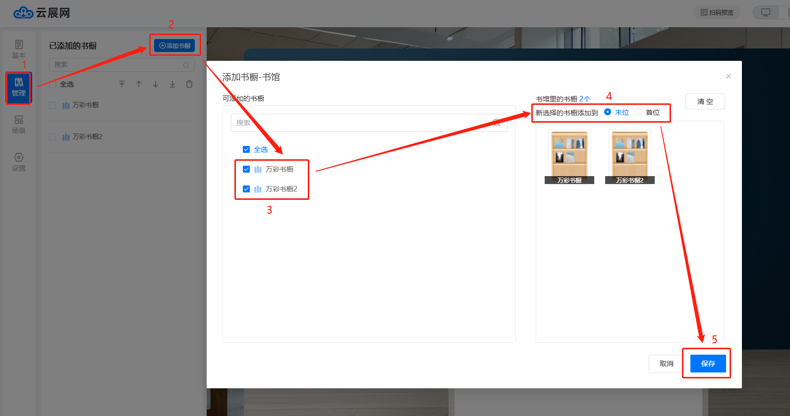 第一個步驟點擊確定之后,會直接跳轉到管理書櫥的界面,點擊【管理】,然后點擊【添加書櫥】,左側勾選需要添加的書櫥,右側選擇新選擇的書櫥添加的位置,點擊右下角保存。