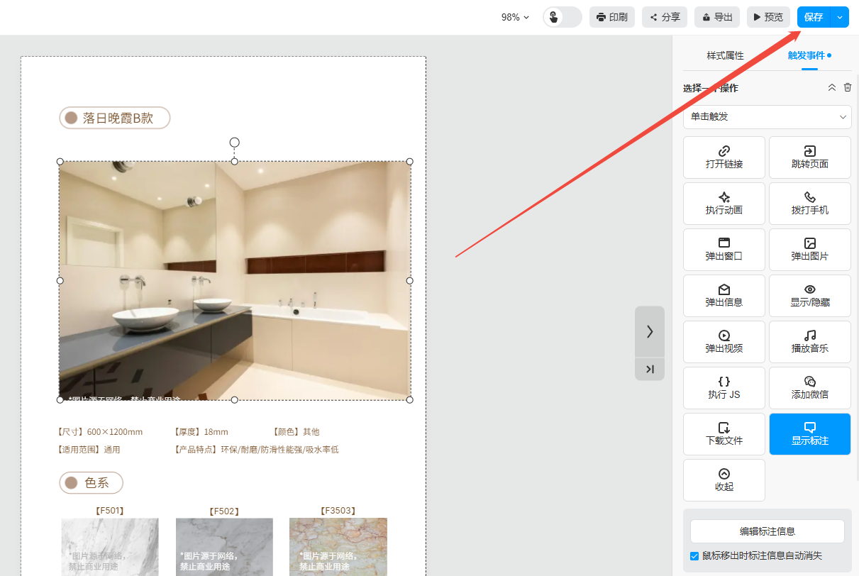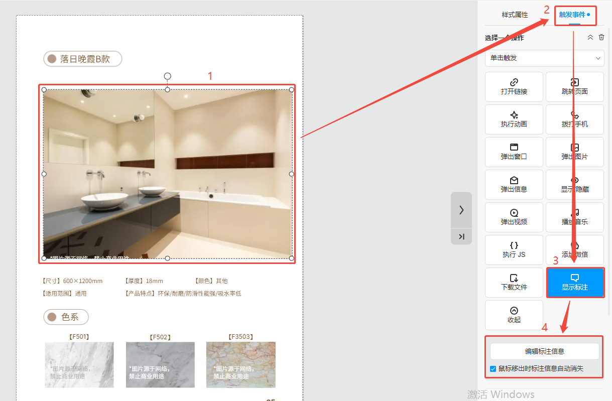 選中需要點擊顯示標注的文字或者圖片,然后在【觸發事件】選擇【顯示標注】,點擊【編輯標注信息】。