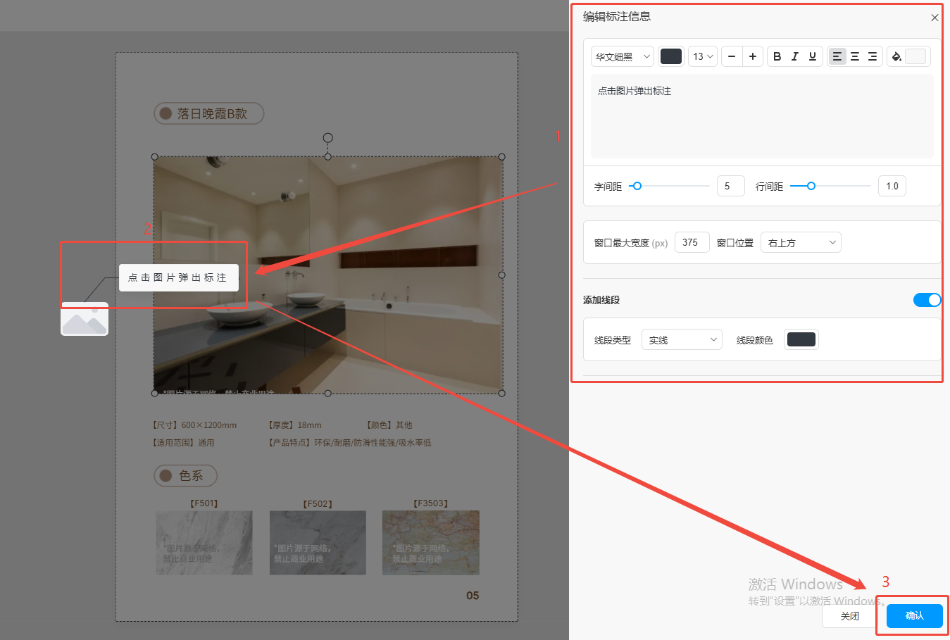 右側輸入標注內容,調整文字樣式,窗口大小,線段樣式,設置好之后點擊右下角【確認】。