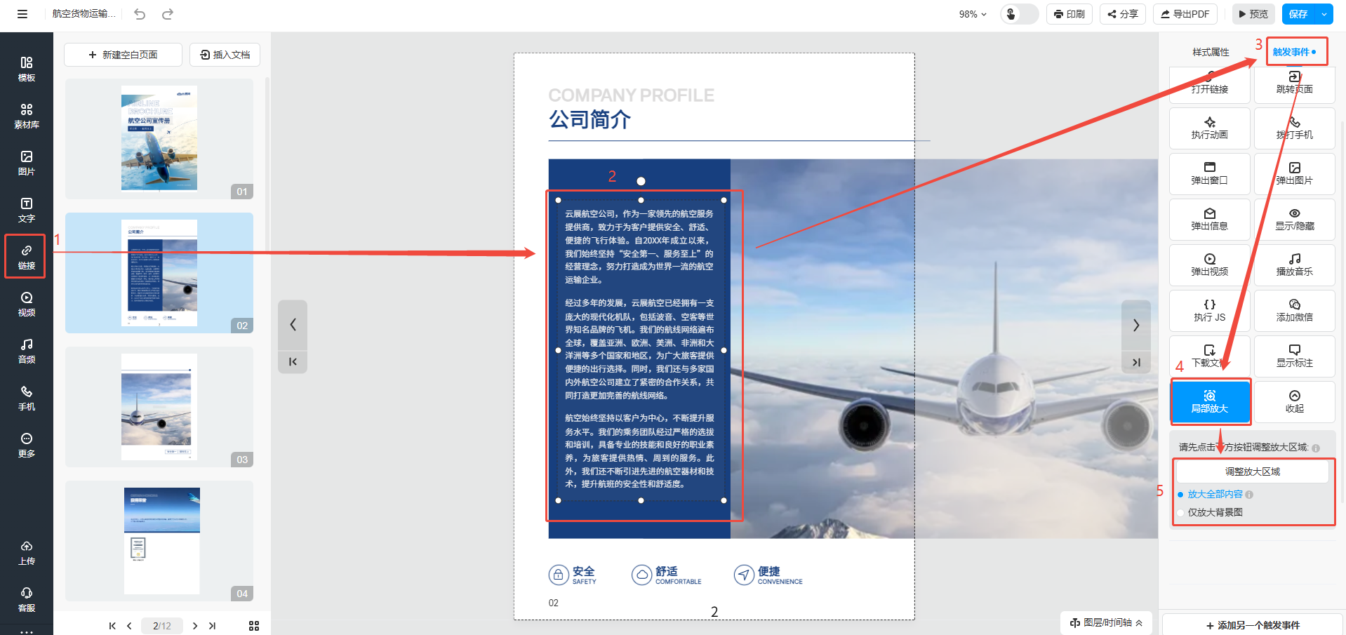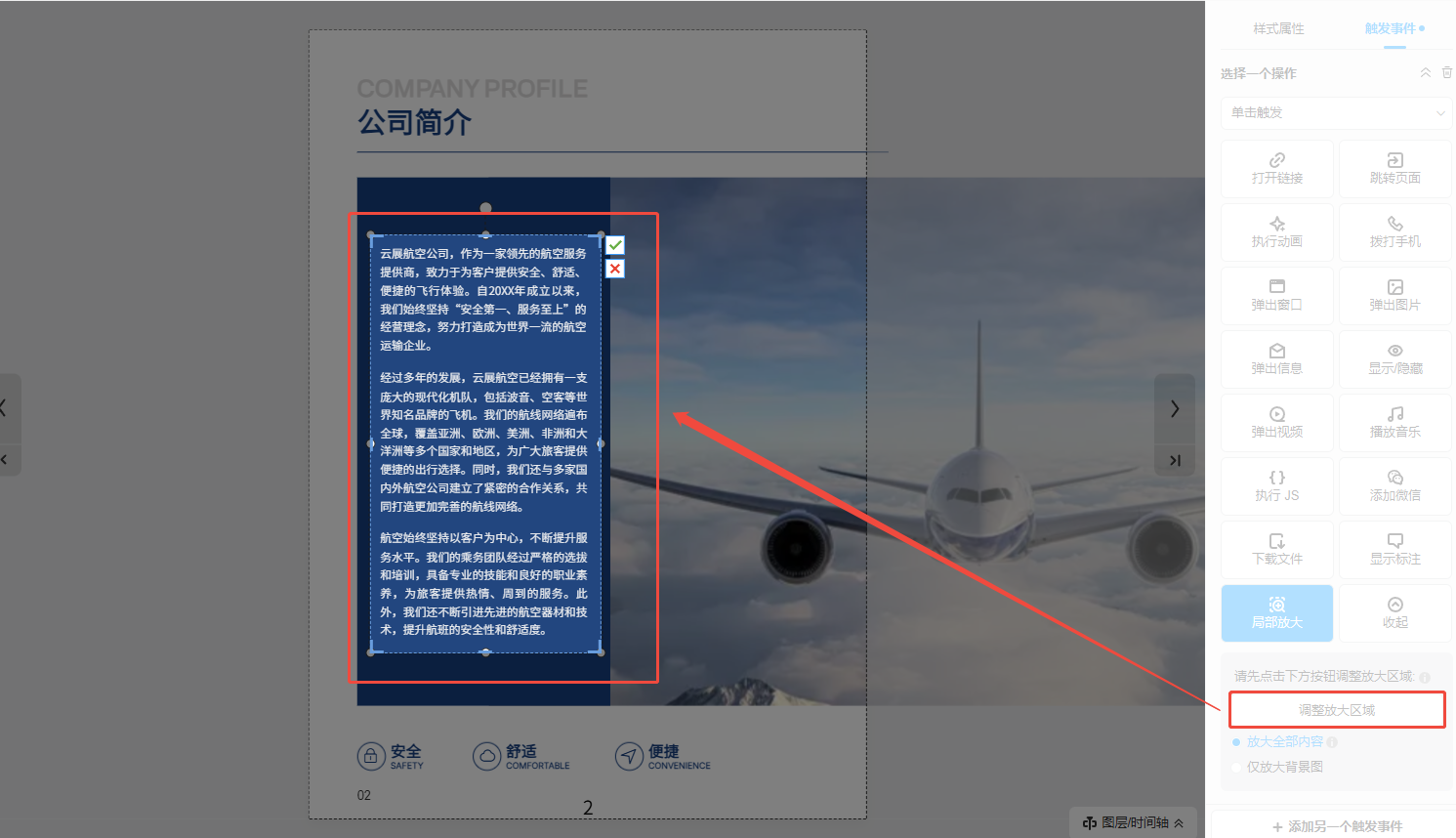 點擊【鏈接】,將鏈接框覆蓋到對應的位置,然后點擊【觸發事件】,選擇【局部放大】,點擊【調整放大區域】,選取需要放大的區域,選取之后選擇放大全部內容或者僅放大背景圖。