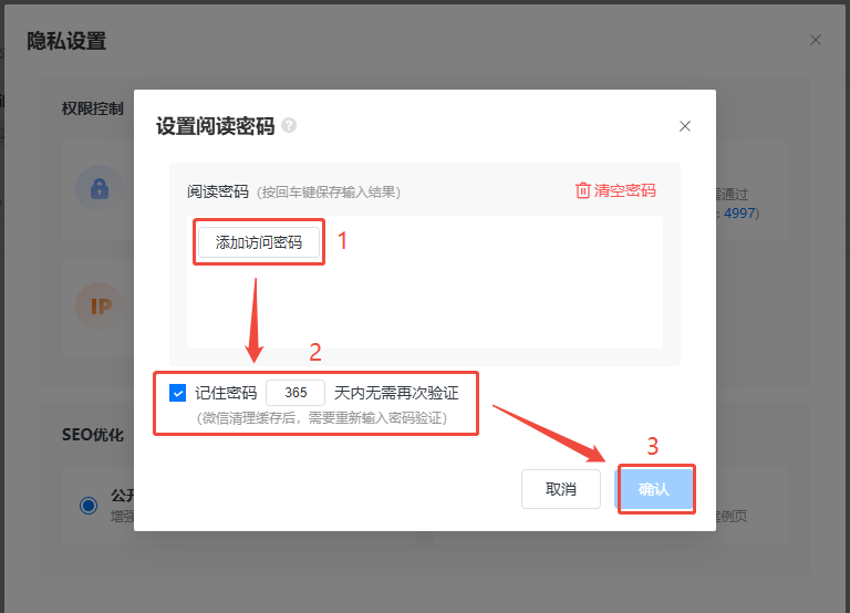 點擊【訪問密碼】輸入一個或者多個密碼,如果您希望讀者在設定的時間段內再次訪問時無需重新輸入密碼驗證,還可以選擇勾選下方的【記住密碼】,并設置密碼間隔時間,最后點擊【確認】。