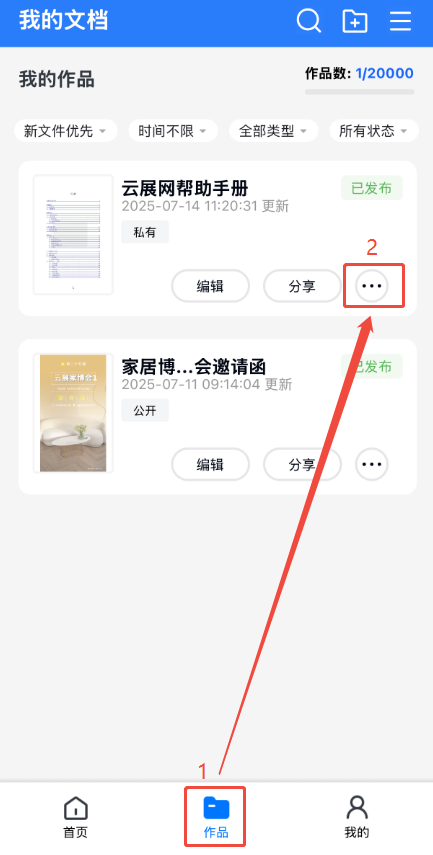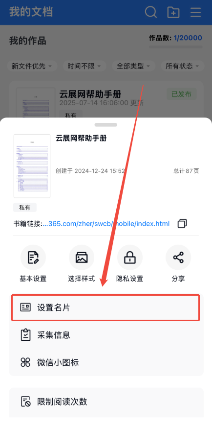 點擊【作品】,點擊對應電子書右邊三個點,然后點擊【設置名片】打開名片設置界面。
