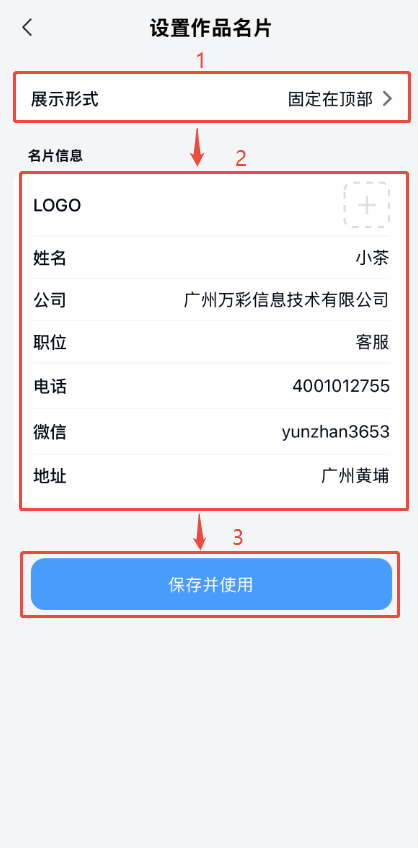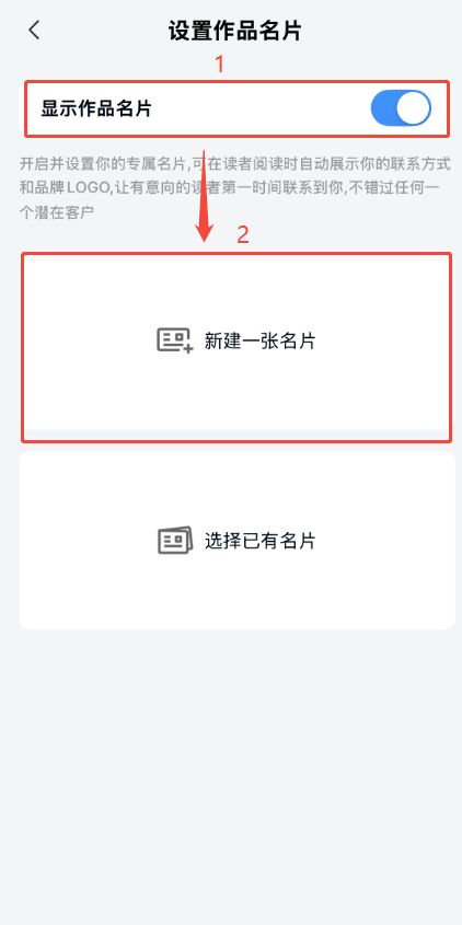 打開【顯示作品名片】,點擊下方【新建一張名片】創建名片,選擇需要的展示形式,完善名片信息后,點擊【保存并使用即可】。