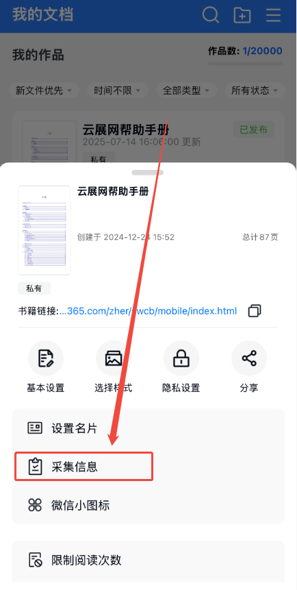點擊【作品】,點擊對應電子書右邊的三個點,然后點擊【采集信息】,打開采集信息界面。
