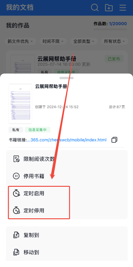 APP上如何設置書本定時啟用/停用功能? 一、功能介紹 如果你上傳的電子書需要在某個時間啟用,或者某個時間停用,可以使用啟用/停用功能進行設置,靈活控制電子書的可用性。 二、操作步驟 1、打開定時啟用/停用界面 點擊【作品】,點擊對應電子書右邊的三個點,然后根據需要點擊【定時啟用】或者【定時停用】,打開界面。 2、設定啟用/停用日期 打開【開啟定時啟用】或者【開啟定時停用】,并選擇啟用日期或者停用日期,點擊確定即可。