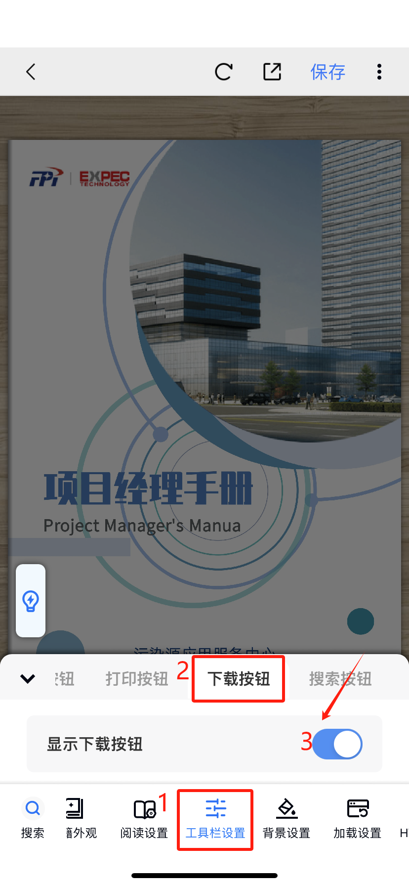 在底部菜單欄【工具欄設(shè)置】上,找到【下載按鈕】點擊,開啟【顯示下載按鈕】