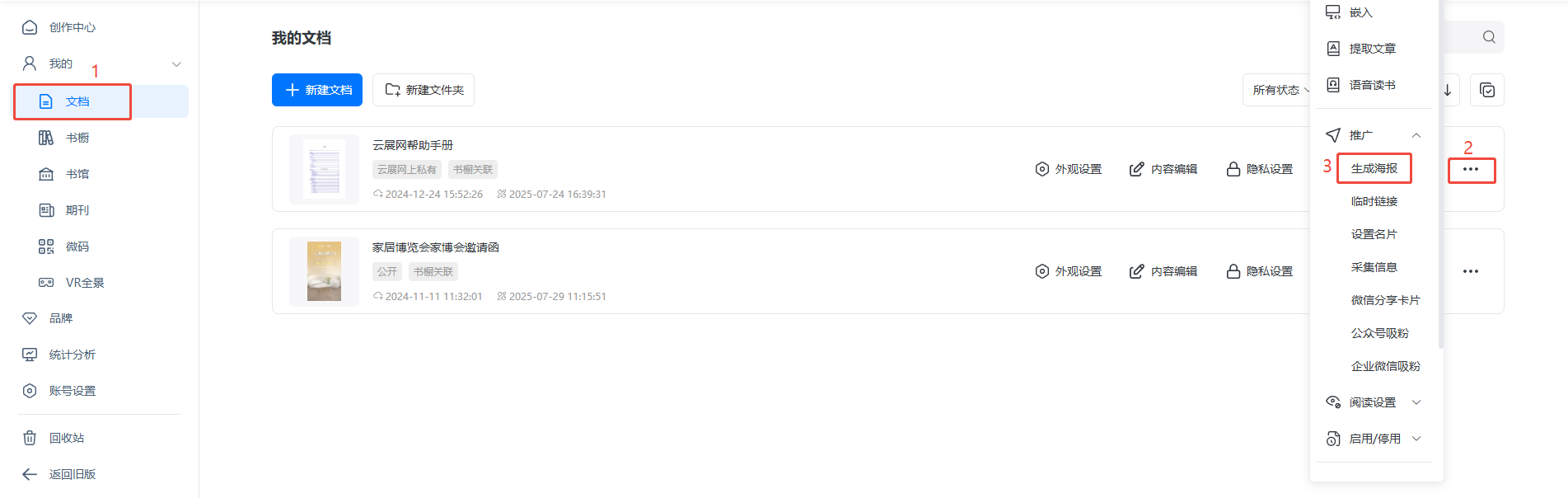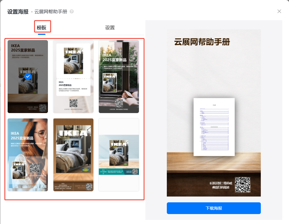如何生成電子書海報? 一、功能介紹 海報,也是向讀者宣傳電子書內容的一種有效方式,通過海報,讀者可以先了解一下基本情況,再掃碼查看書本內容,讀者也可以分享海報給其他朋友,有利于深度宣傳。 二、操作步驟 1、生成海報 點擊【文檔】,然后點擊對應電子書的右邊三個點,再點擊【推廣】,最后點擊【生成海報】。 2、選擇海報模板 選擇一個海報模板。 3、編輯海報信息 點擊【設置】,下方輸入海報信息,點擊【保存信息】即可保存,最后點擊右側【下載海報】即可下載下來。
