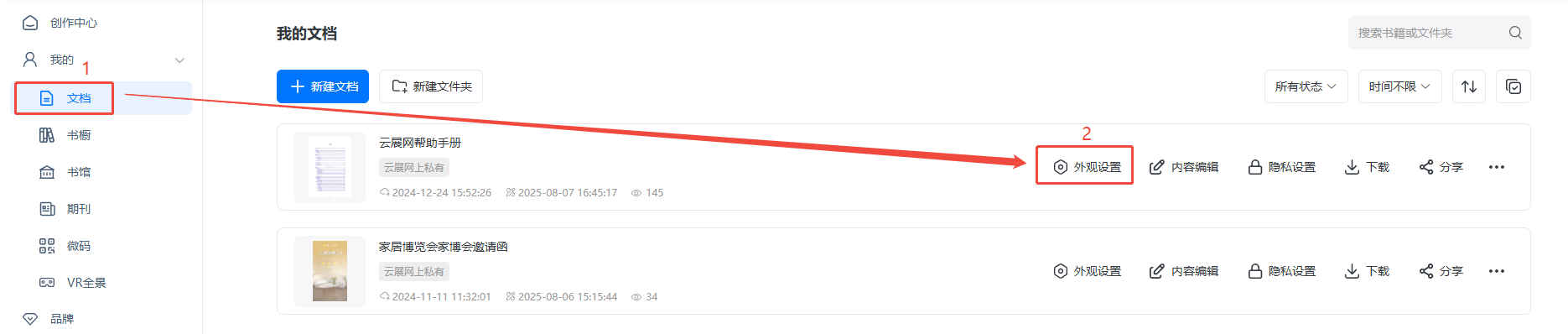 點擊【文檔】,找到對應電子書,點擊【外觀設置】。