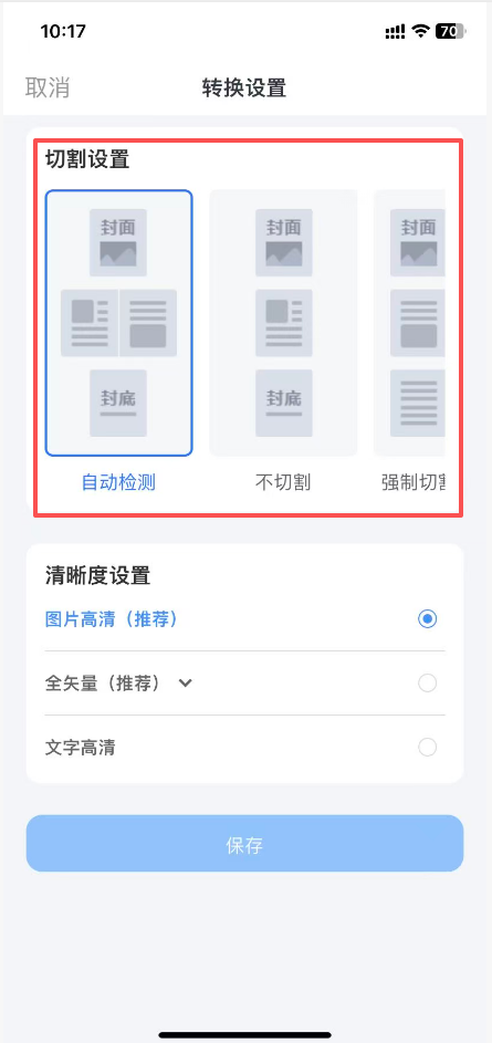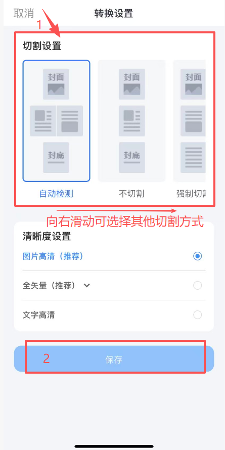 點擊【轉換設置】打開,選擇切割方式后,點擊【保存】,隨后繼續(xù)上傳文檔進行制作