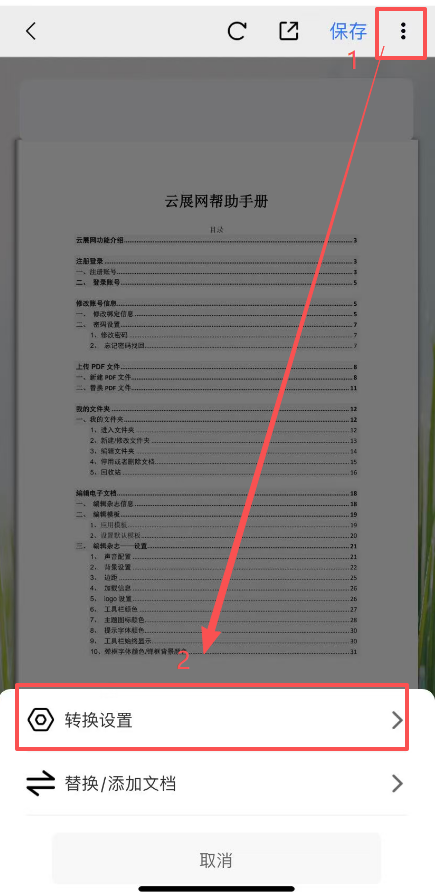 點擊右上角“三個點按鈕”,點擊【轉換設置】打開