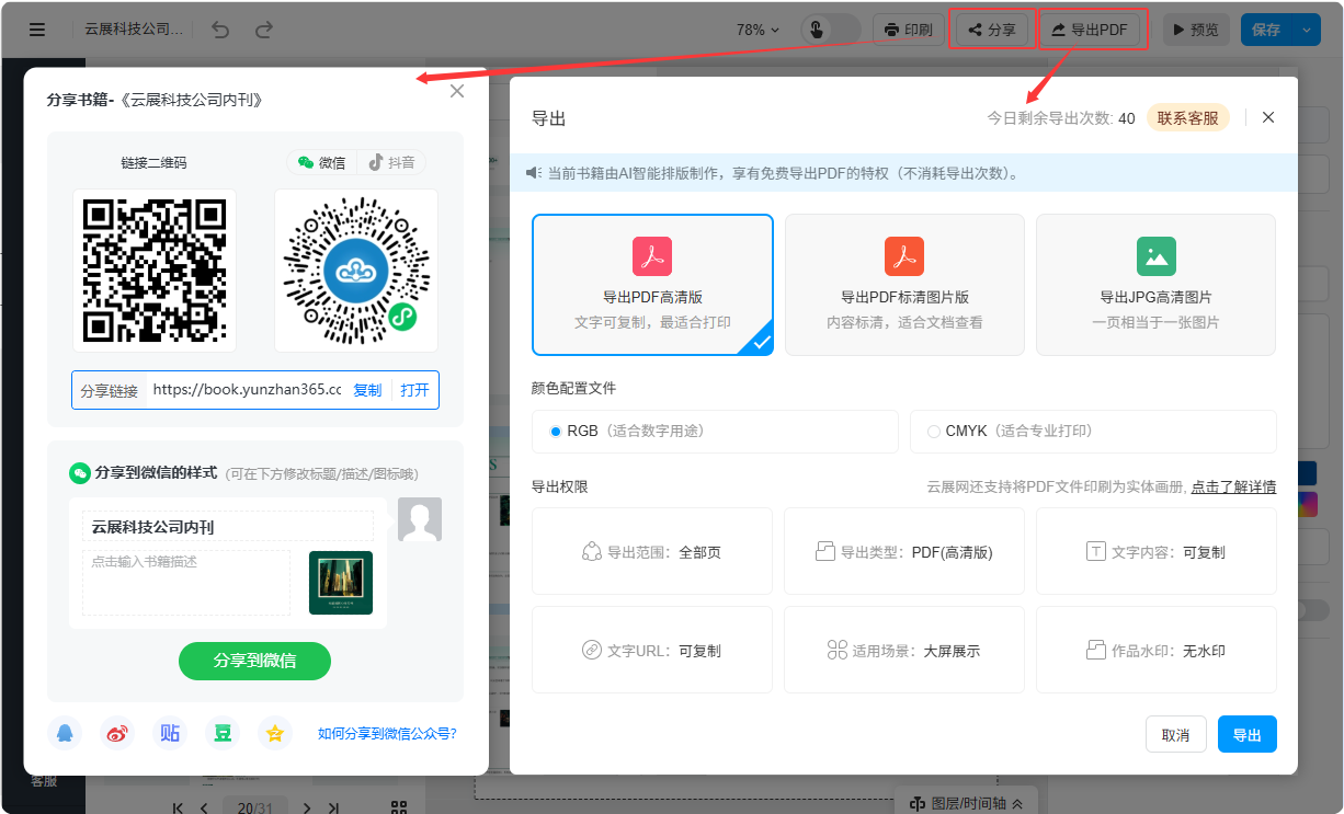 頁面渲染完成后,如需修改內容,可直接在多媒體編輯器中進行調整。制作完成后, 可在線分享書籍或導出高清PDF。
