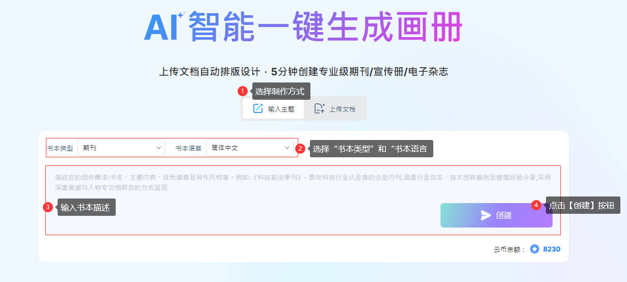 1). 點擊【輸入主題】→ 選擇【書籍類型】→ 選擇【書籍語言】→ 在文本框中輸入主題描述 → 點擊【創建】