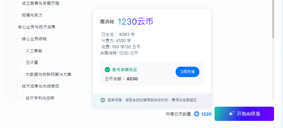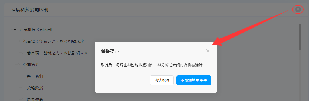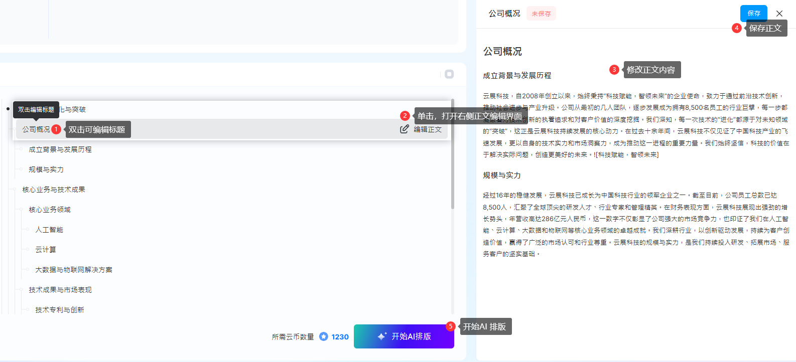 2). 等待AI分析主題并生成大綱 → 編輯大綱標題或正文 → 預覽需消耗的云幣→ 點擊【開始AI排版】進入多媒體編輯器排版。