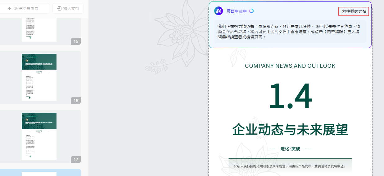 (3)點擊【開始AI排版】后, 即進入多媒體編輯器, AI將會逐一渲染頁面。無需等待生成完成,您可點擊【前往我的文檔】繼續其他創作。