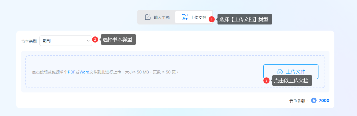 (1) 點擊【上傳文件】→ 選擇【書籍類型】→ 點擊【上傳文件】或將文件拖入上傳框