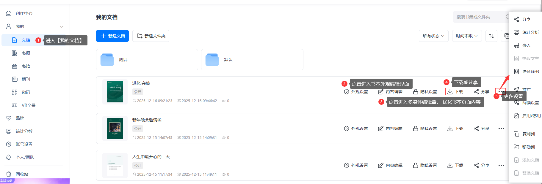 最終,書本將顯示在【我的文檔】中。 您可以進一步編輯優化, 或進行其他操作, 如下載或分享。
