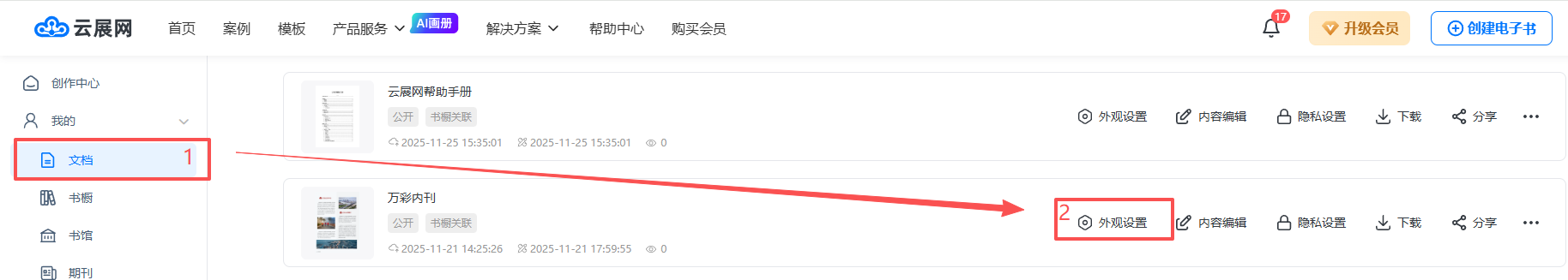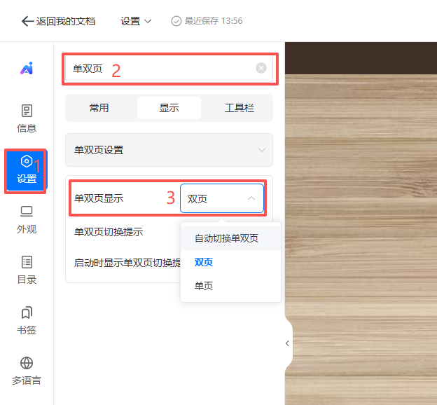 如何實現手機端豎屏雙頁顯示? 一、功能介紹 此功能可以讓電子畫冊在手機端上豎屏雙頁顯示。 二、操作步驟 1、打開編輯界面 點擊【文檔】,選擇需要設置的電子畫冊,點擊【外觀設置】。 2、設置雙頁顯示 點擊【設置】,在搜索欄輸入“單雙頁”,【單雙頁顯示】選擇“雙頁”即可。 3、預覽效果 點擊右上角的手機預覽按鈕,可查看手機端豎屏雙頁效果