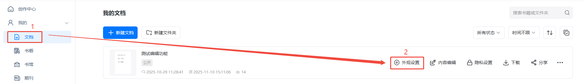 在【文檔】頁面,找到對應電子畫冊,點擊【外觀設置】。