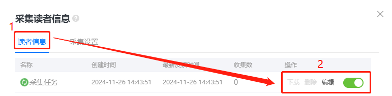 采集的數據是實時的,可以根據操作步驟的第一步打開采集讀者信息,點擊【讀者信息】查看采集到的數據,支持下載數據,刪除或者暫停采集任務。