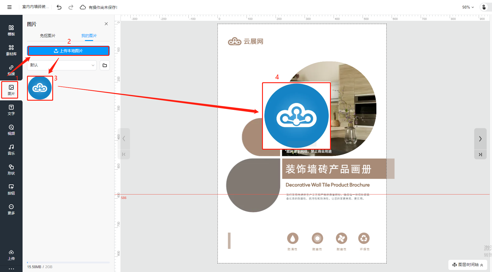 選擇【圖片】進入圖片界面,點擊【上傳本地圖片】,選擇電腦上的圖片進行上傳,上傳成功的圖片會出現在下方圖片欄,再次點擊一下圖片,圖片會直接出現在頁面上,點擊拖動可以調整位置,也可以調整大小。