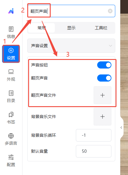 翻頁聲音文件:點(diǎn)擊加號上傳MP3格式聲音文件作為翻頁聲音,文件限制30K以內(nèi)。