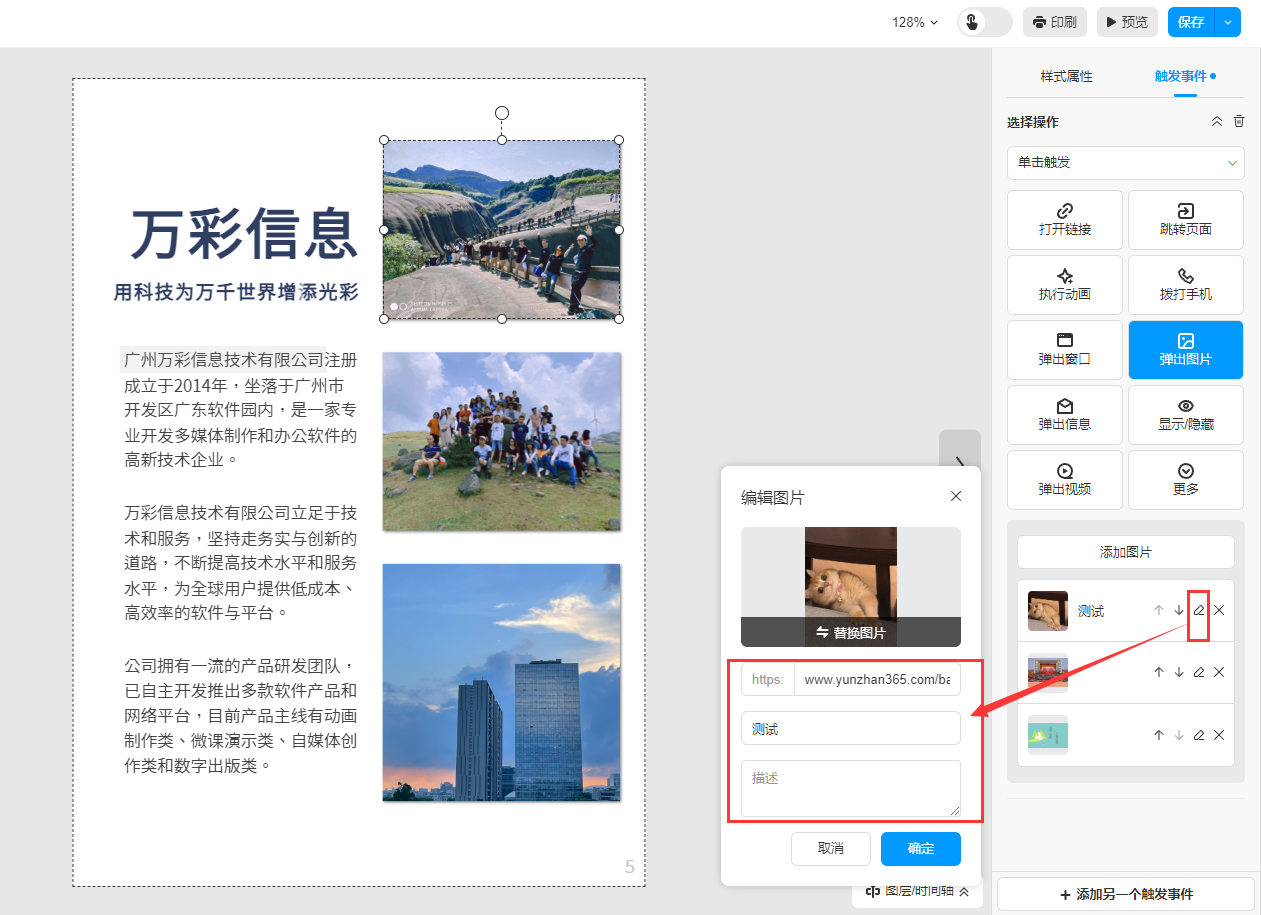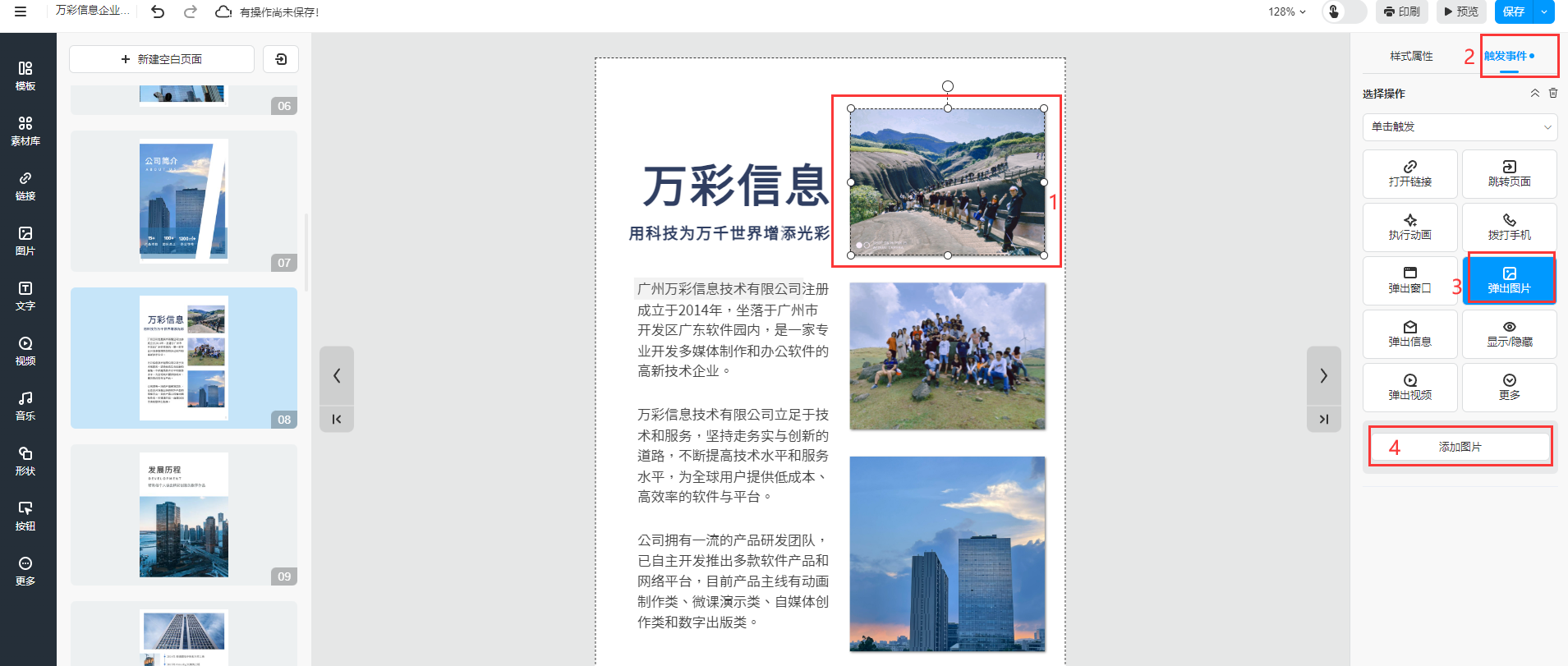 ①、選中需要彈出圖片的位置,可以是文字或者圖片,然后點擊【觸發事件】選擇【彈出圖片】