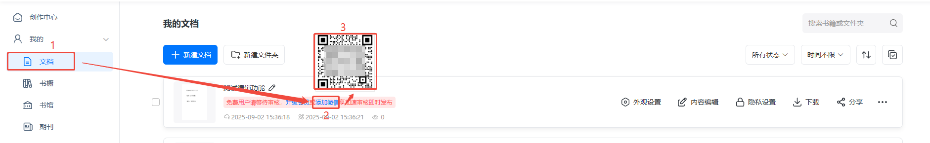 (2)點擊【文檔】找到正在審核中的電子書,鼠標移動到藍色字體【添加微信】會顯示出微信二維碼,掃碼添加即可。