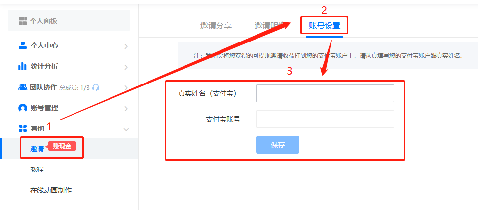 點擊【邀請】,然后點擊【賬號設置】,下方填寫支付寶真實姓名和支付寶賬號,并保存。