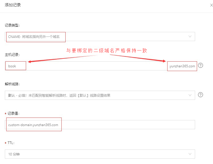 c 選擇CNAME指向另一個(gè)域名,在主機(jī)記錄填寫您綁定到云展網(wǎng)的二級(jí)域名,記錄值填寫:custom-domain.yunzhan365.com