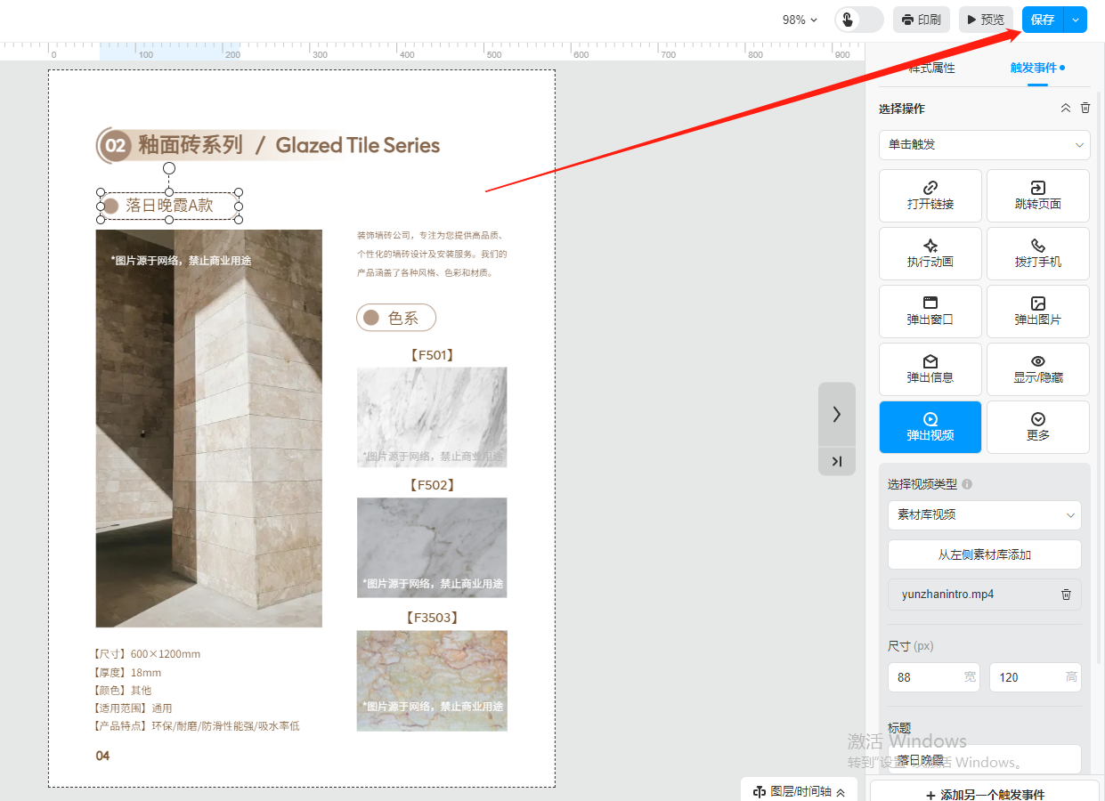 選中需要彈出視頻的文字或者圖片,然后在【觸發事件】選擇【彈出視頻】,選擇視頻類型。