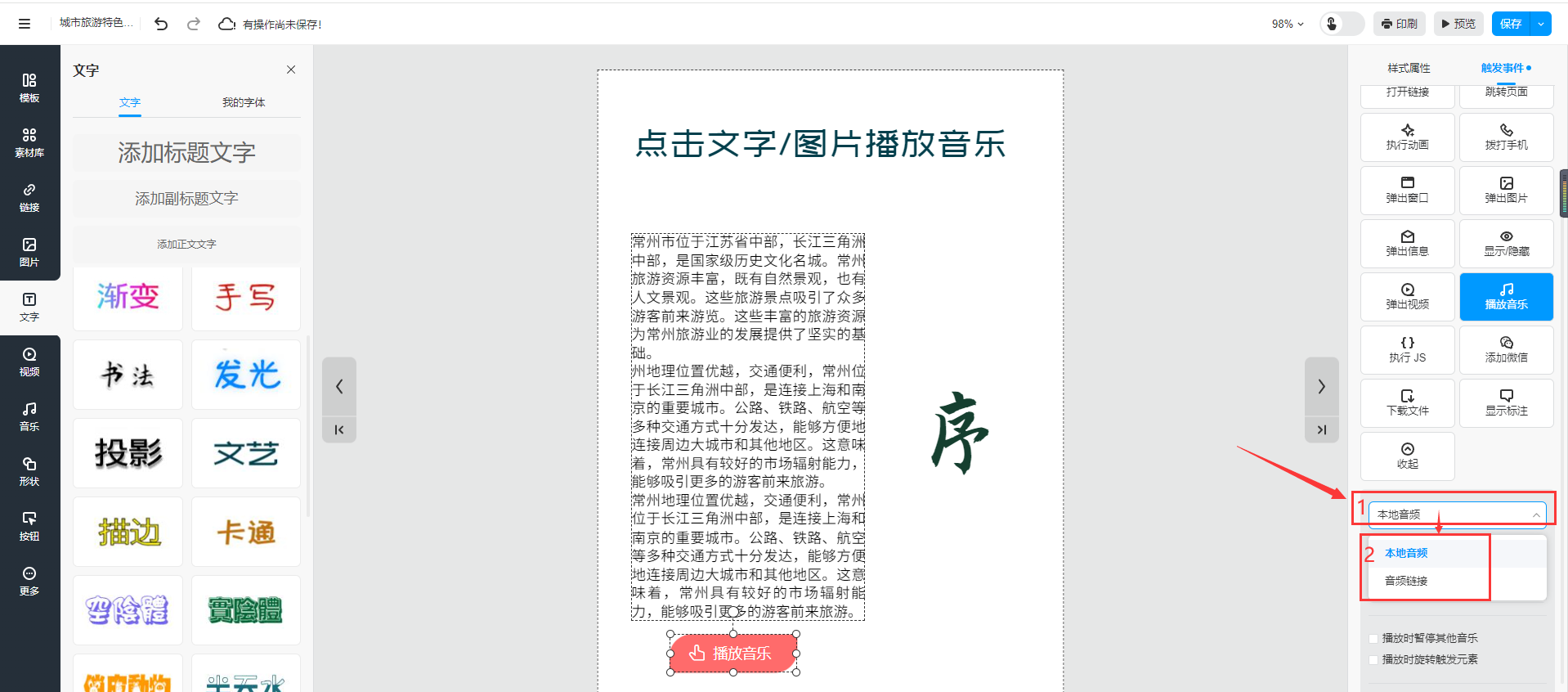 選中需要播放音樂的文字或者圖片,然后點擊【觸發(fā)事件】選擇【播放音樂】