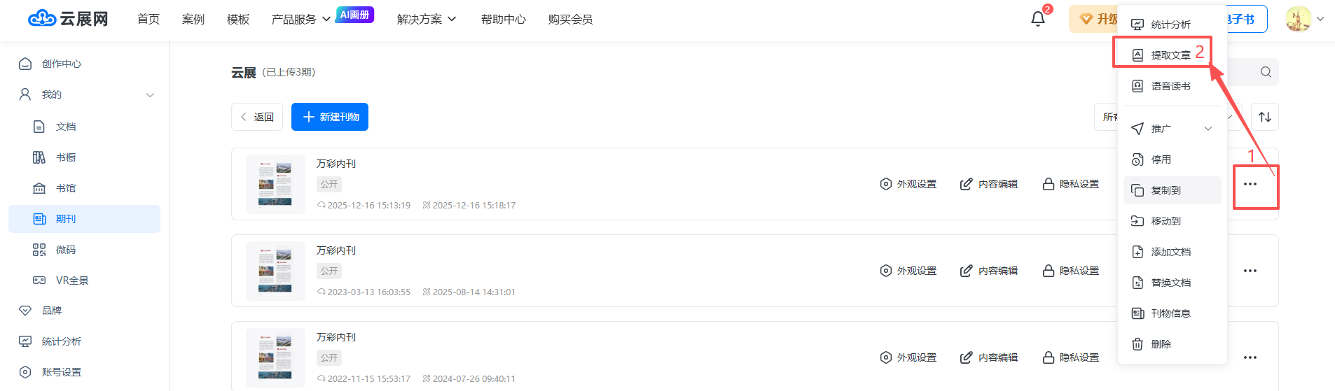 找到對應的書,點擊【…】,點擊【提取文章】進入編輯頁面。