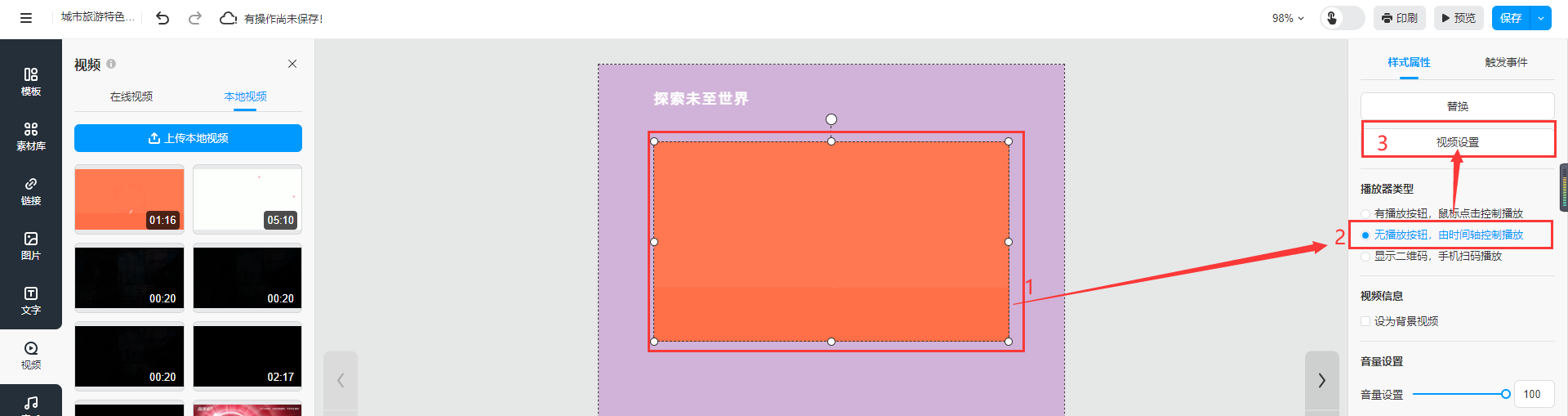 選中本地視頻,選擇【無播放按鈕,由時間軸控制播放】,然后點擊【視頻設置】