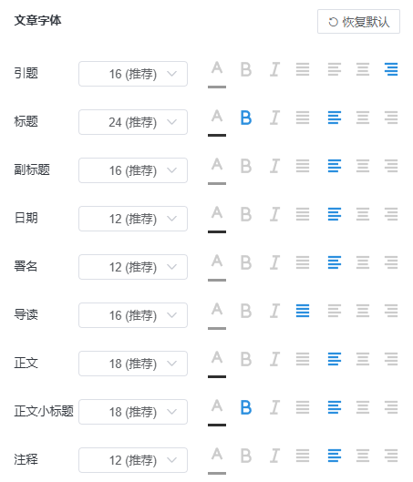 文章設置 一 功能介紹 文章設置,可以對文章的頭尾部展示圖,字體大小,間距,熱區顏色進行配置。 二 操作步驟 1 設置文字頭圖尾圖 給文章上下兩邊設置圖片,可以用于展示廣告宣傳圖之類的,并且可以設置圖片跳轉鏈接。 2 字體 設置字體大小,對齊等樣式 3 段落與排版 設置字/段落間距。 4 文字熱區顏色 設置熱區展示顏色,提醒讀者可以點擊。 5 文章內容允許復制 開啟:彈出文章內容的文字可以復制; 關閉:彈出文章內容的文字不能復制。