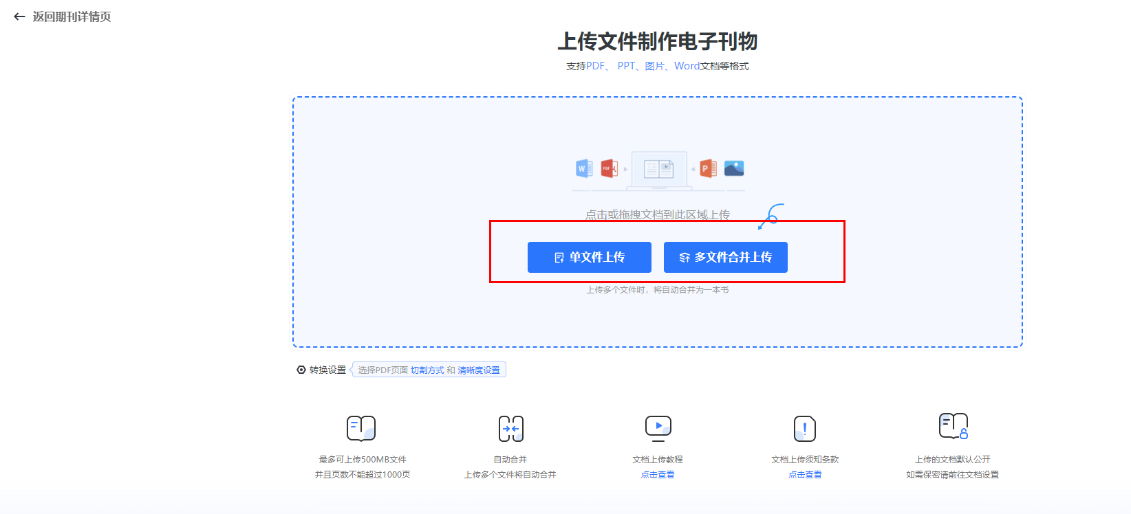 (2)點擊【單文件上傳】/【多文件合并上傳】,選擇刊物文檔上傳
