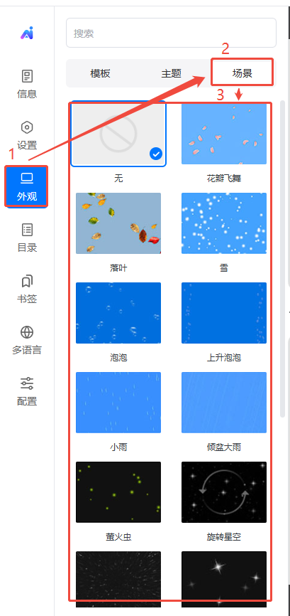 點擊【外觀】,然后點擊【場景】,在下方選擇一個場景單擊應用即可。