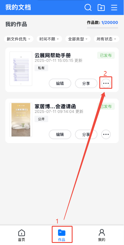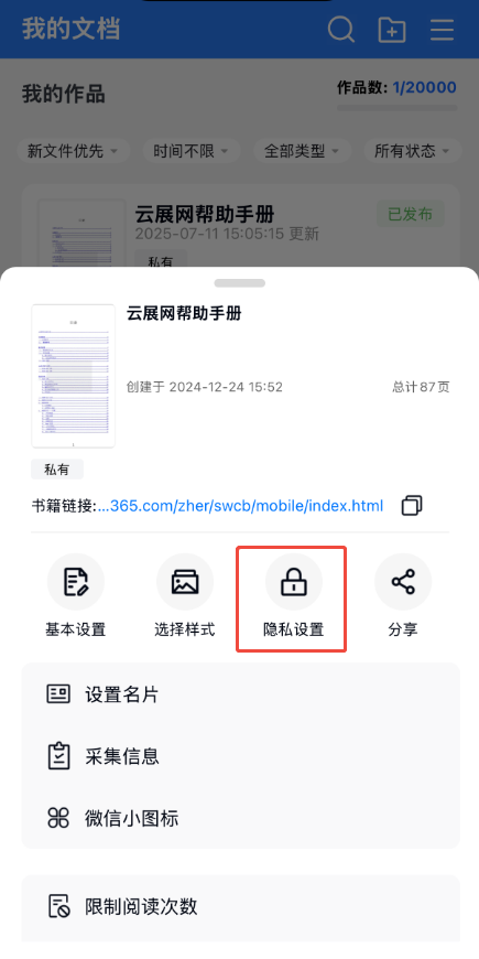 打開云展app,點擊【作品】,點擊書本旁邊三個點,然后點擊【隱私設置】。