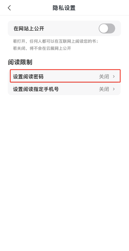 點擊【設置閱讀密碼】,將【開啟閱讀密碼】打開,在下方密碼框輸入密碼,可以輸入一個或者多個,也可以根據自己需要設置訪問提示,設置完點左上角箭頭退出即可。