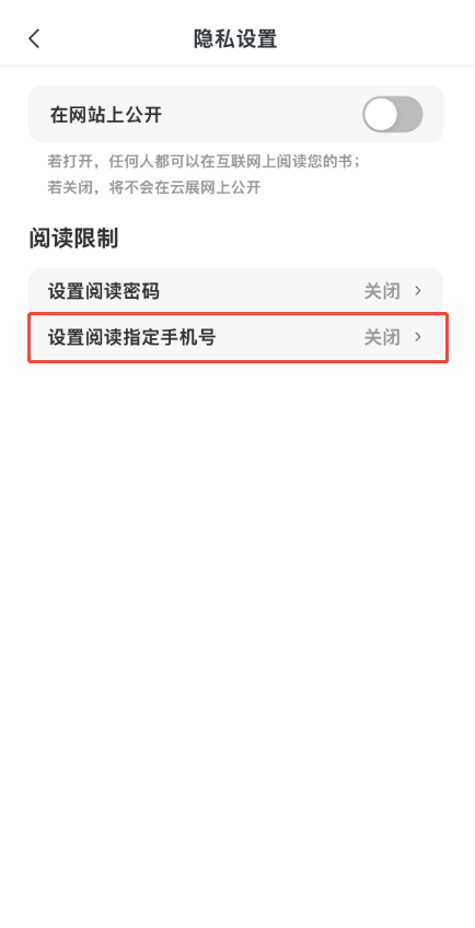 點擊【設置閱讀指定手機號】,將【開啟手機號限制】打開,在下方手機號列表框輸入手機號,可以輸入一個或者多個,也可以根據自己需要設置訪問提示,設置完點左上角箭頭退出即可。