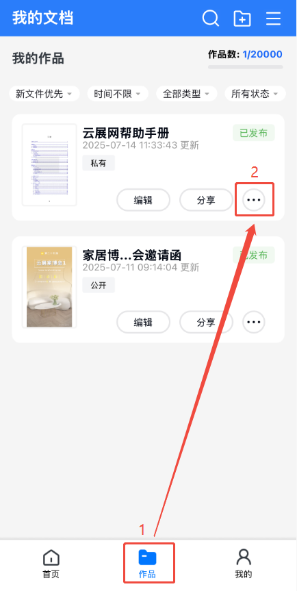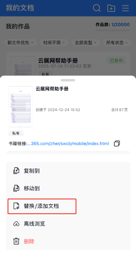 點擊【作品】,點擊對應電子書右邊的三個點,然后點擊【替換/添加文檔】,打開替換文檔界面。