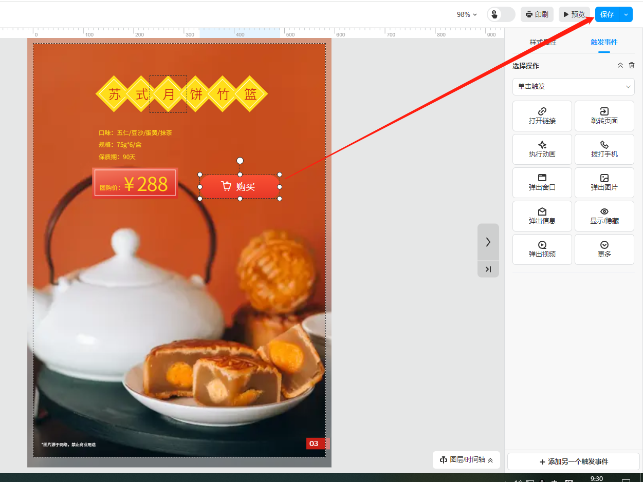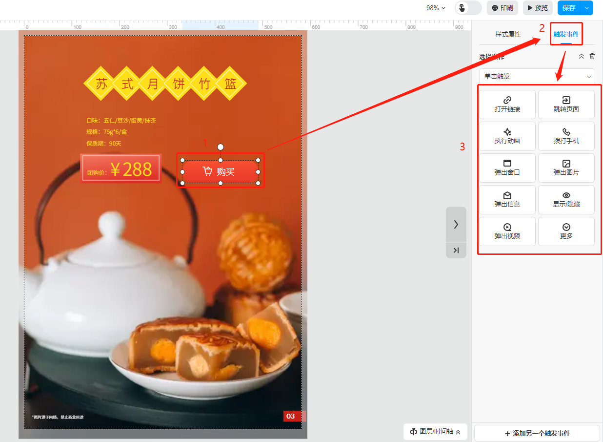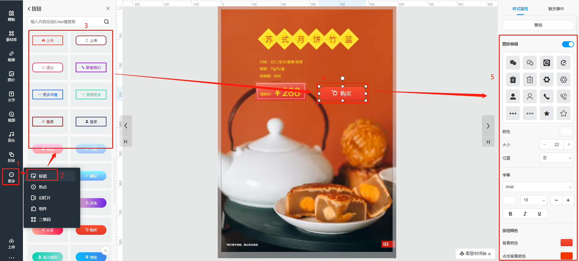 點擊【更多】,選擇【按鈕】,挑選一個功能按鈕,點擊便會出現在頁面上,移動到合適的位置,雙擊按鈕可以更改文字,右側可更改其他樣式屬性。