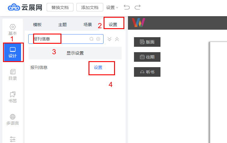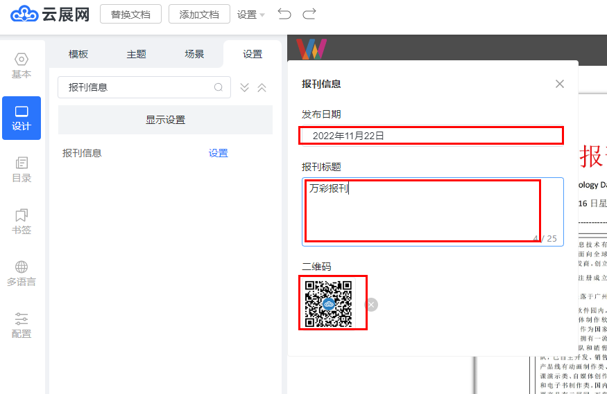 如何設置報刊信息 一、功能介紹 報刊信息主要作用于讓報刊看起來更專業一點,并且您可以添加二維碼方便讀者聯系您。 二、操作步驟 1、在【我的期刊】找到需要設置的書,點擊【編輯】 2、點擊【設計】,【設置】,搜索報刊信息,點擊【設置】 3、輸入發布日期,標題,上傳二維碼圖,二維碼圖可以是您的微信二維碼,設置好以后保存