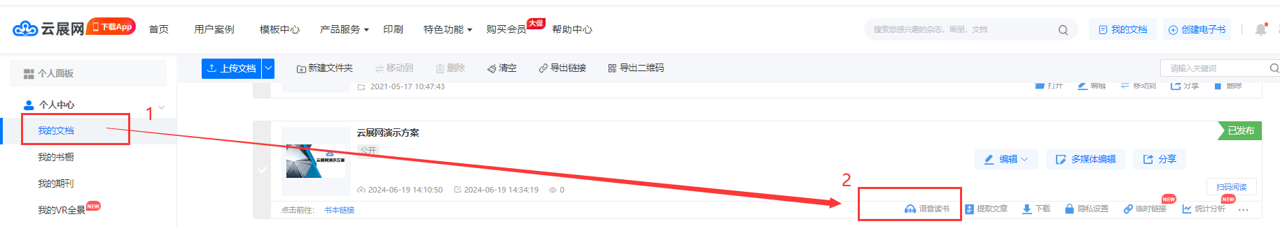 在【我的文檔】頁面,點擊【語音讀書】進入
