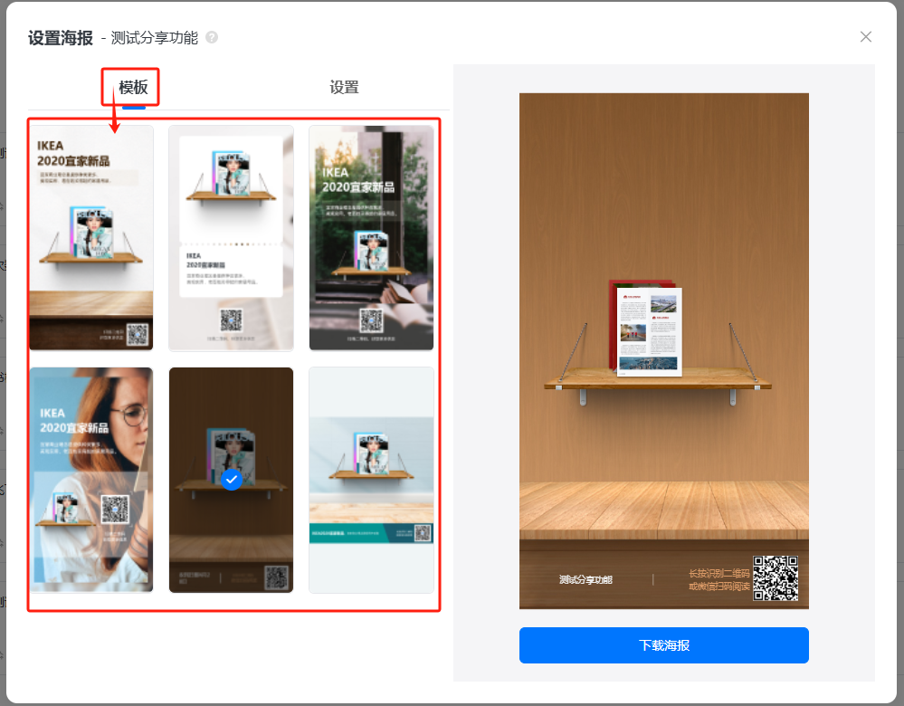 如何生成書櫥海報? 一、功能介紹 電子海報,也是日常中常見的一種宣傳方式,海報不僅能提高品牌形象,還能拓展品牌認知度,有利于推廣市場。讀者掃碼進入書櫥,可以同時看到書櫥里的所有書,還能互相轉發,非常方便。 二、操作步驟 1、生成海報 在【書櫥】頁面,點擊右邊三個點,隨后點擊【推廣】,點擊【生成海報】。 2、選擇模板 點擊【模板】,選擇一款合適的模板。 3、編輯海報內容 點擊【設置】,編輯海報內容。 4、下載海報 編輯好之后點擊【保存信息】,然后點擊【下載海報】,即可下載下來。