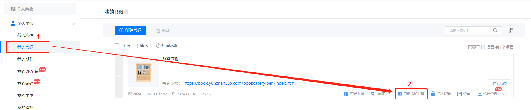 (1)先點擊【我的書櫥】,找到對應的書櫥再點擊【自動添加書籍】。